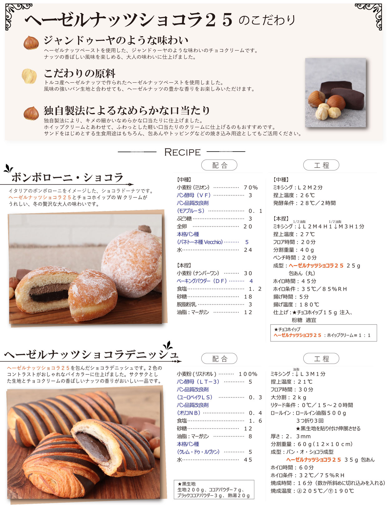 ※商品名称が「冬のヘーゼルナッツショコラ」から「ヘーゼルナッツショコラ25」に変更になりました。トルコ産ヘーゼルナッツペーストを使用した、ジャンドゥーヤのような香ばしい味わいのチョコクリームです。ナッツの香ばしい風味を楽しめる大人の味わいに仕上げました。風味の強いパン生地と合わせても、ヘーゼルナッツの豊かな香りを楽しめます。ホイップクリームとあわせて、ふわっとした軽い口当たりのクリームに仕上げるのもオススメです。